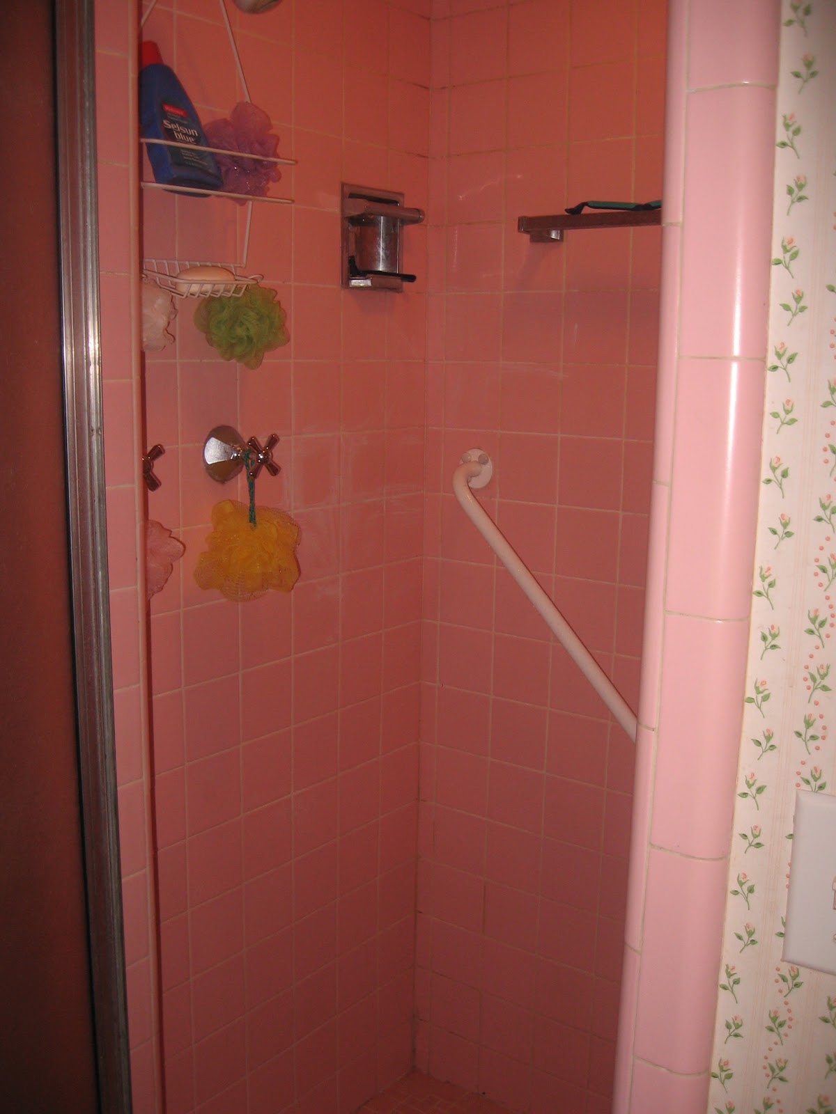 I cleaned the shower!!! Will miracles never cease??!!  It was disgusting!  You did not want to see a before photo, trust me.  And yes, the entire bathroom is pink tile, see: