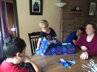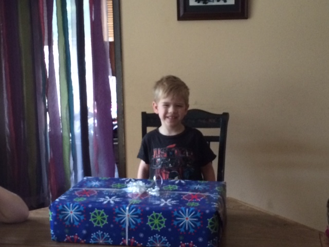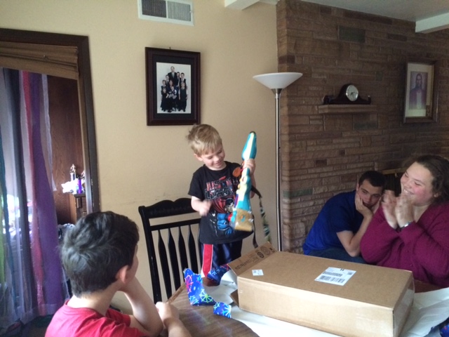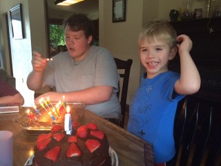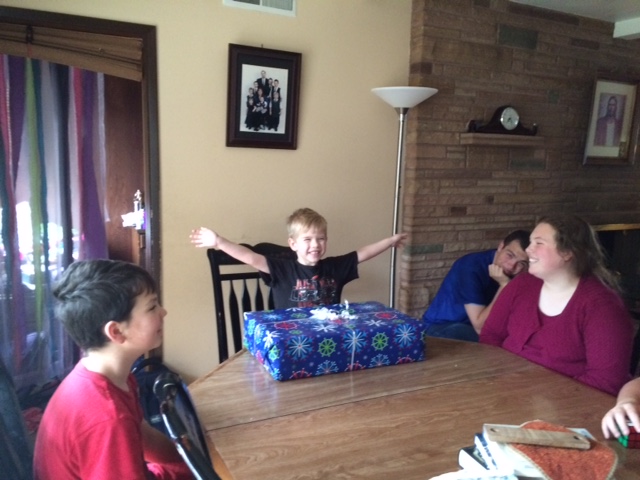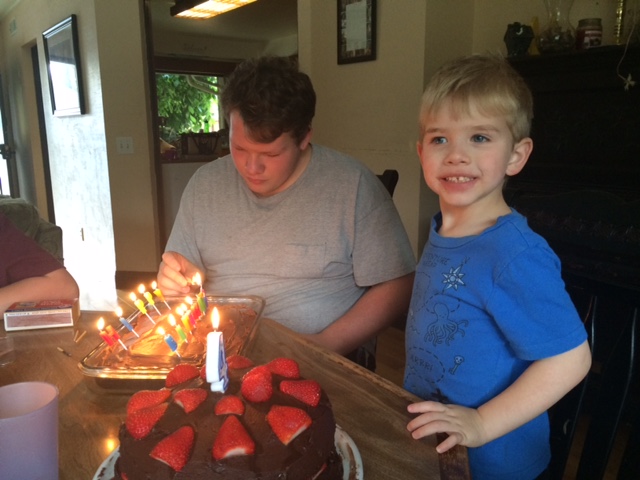 Later that night, we had cake. Spike, because of his allergies, had to have special hot dogs, special bread, special powdered sugar (for frosting), special cake, and special ice cream. When I called Drew to tell him that Spike’s birthday dinner (birthday person chooses the menu) was going to be $50 for hot dogs, cake and ice cream, he had a heart attack. He asked me if we couldn’t pare that down. So I figured out that it was cheaper to buy another cake and frosting, than to buy enough powdered sugar that Spike could eat for all of us to have his cake. So we made two. And we decided to just do without the ice cream. That cut it down $20. Seriously. And we had the missionaries stop by!! They brought him presents and that made him feel super special, and we obviously had plenty of cake.