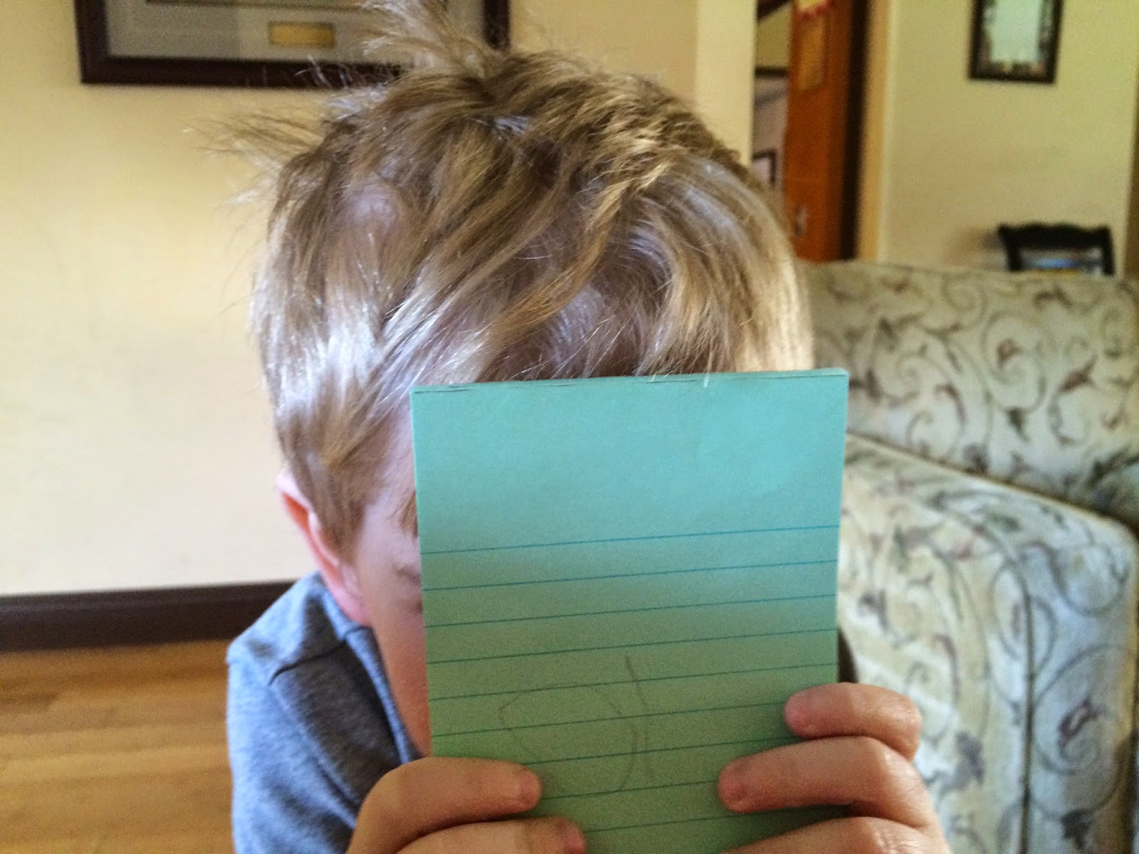 We calmed down and hugged each other after the ordeal. He apologized for being obnoxious. I told him I was sorry that I had to give him consequences, but if he had been willing to cooperate, they never would have come. Then the test of all time. I told him it was time to change his shirt and take off the angry birds one. I gave him the choice between two other shirts, the one he screamed about trying on the week before (hand-me-down, which is two sizes too large, white,and had to have the sleeves rolled up) or the new, pretty blue striped one, which fits, that I picked up at the thrift store.