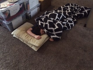 I went in at 5:45 a.m. She wasn’t sleeping in her bed. She slept with Spike again. She does that sometimes because it is hard for him to sleep by himself. I don’t know why. I really like sleeping by myself! I roused her, pulled the covers off and said, “hey, it is time to go….get out of bed.” Then I left the room.