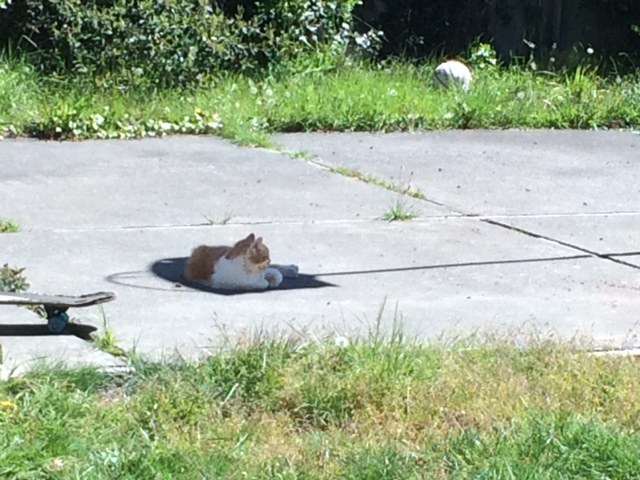 This week, we actually had 80 degree weather! Just one day, of course. But I weeded the gardening area next to the deck, which I haven’t done for at least two years. And I transplanted the raspberries that were growing the grass of the back yard into that little patch of earth. Of course, my cat thought it was too hot. I thought it was hysterical that he was trying to keep his body in the shade of the basketball hoop!