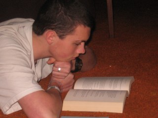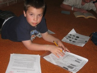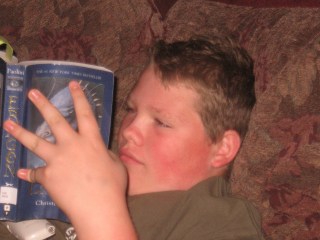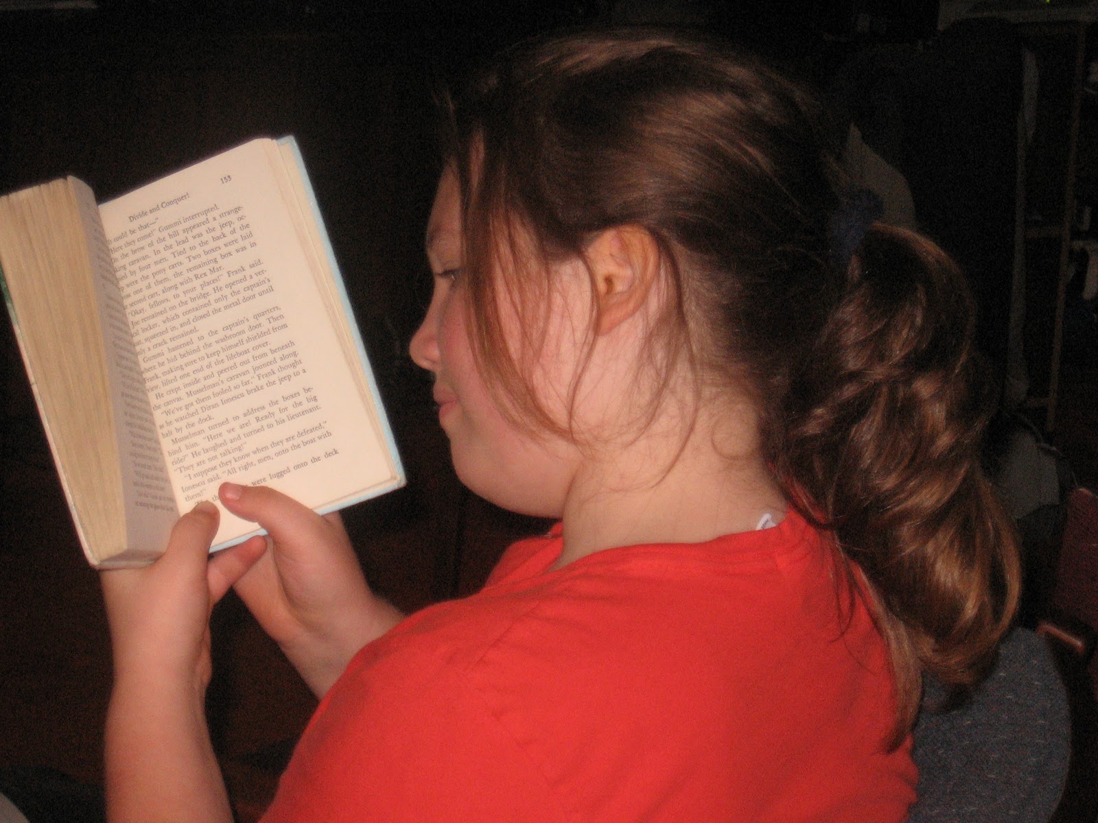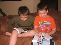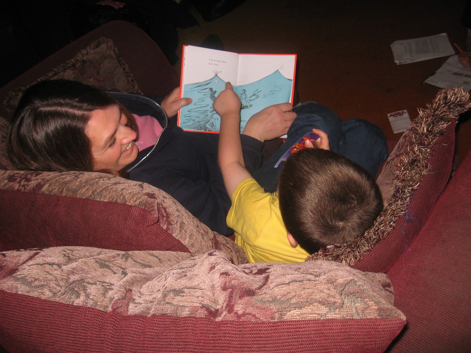 Earlier this week, Drew was working late. Dinner was over and cleaned up. The TV was off. Michael Buble was playing on the computer. Jacob was chatting on line. Joshua and I were reading ‘Green Eggs & Ham’ and all of the other kids were laying around in the family room reading books. It looked like this: