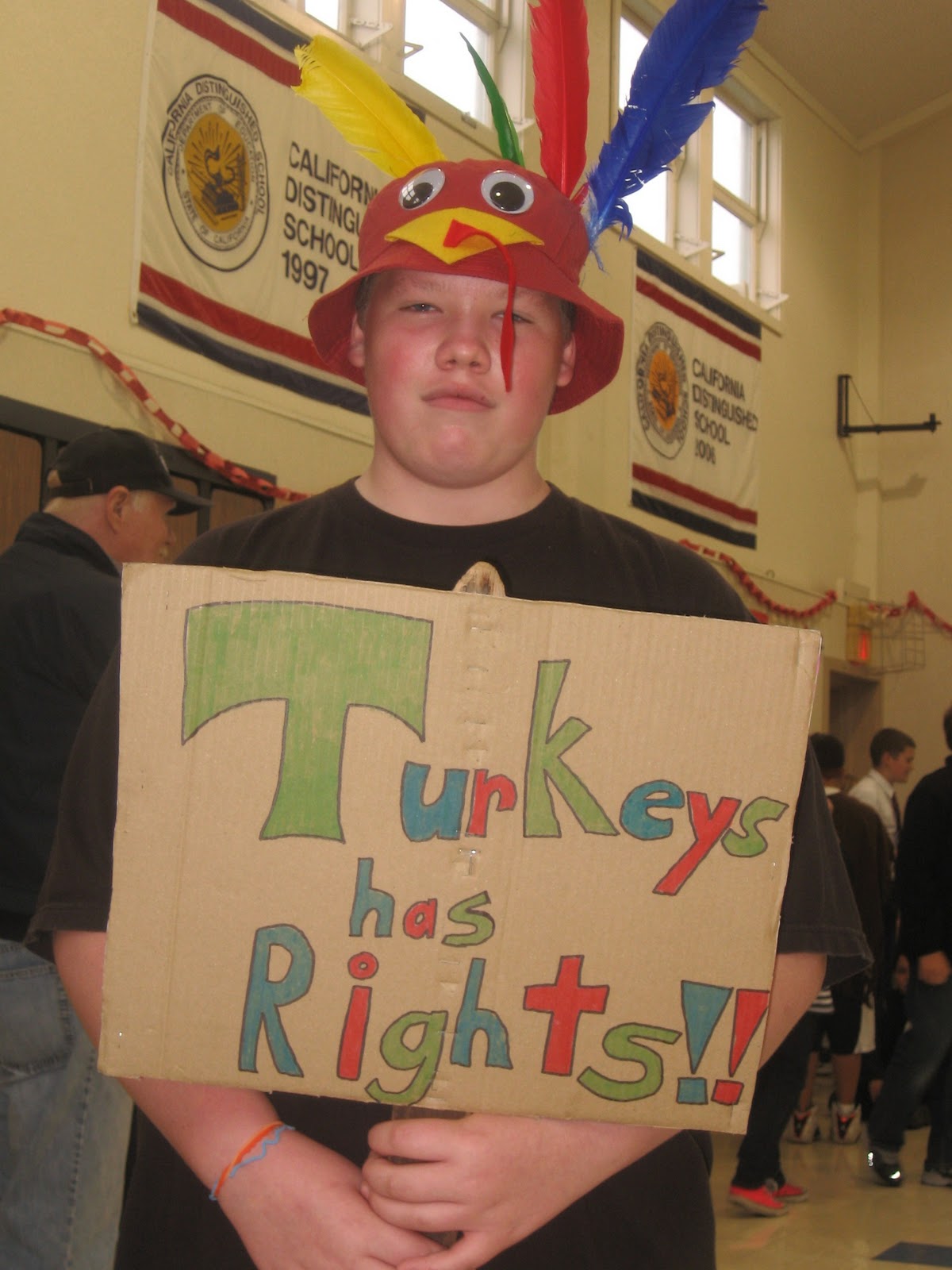 Well….here is my famous little turkey! The sixth grade class performed their annual Turkey play. (All the Turkey’s go on strike because they are tired of disappearing at Christmas. The cranberries think they should be the main course–they are tired of being a side dish. The squashes vie for more eatable options–like milkshakes, cake and in your cereal. The mediators and arbitrators fight about who can fix the crises. The news media reports on the event and the stress between the football players, who can’t play if the turkeys on on strike, the turkeys, and the Joe Q. Public, who don’t want to change Thanksgiving from Thursday to another day of the week to resolve the issue…..plus a few others, not mentioned.) It is one of my favorite performances each year. I watch it over and over even when my children aren’t in it. Total run time is 30 minutes with intro and everything.