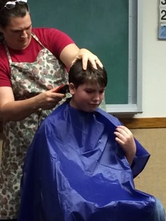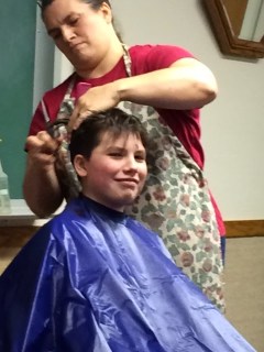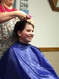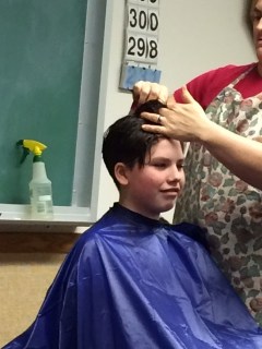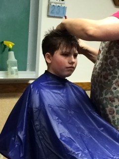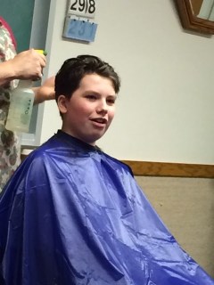 We let him get out of the chair and then Sun said, “Hey Mom, he still has a line in the back of his head!” So we sat him back down and blended that line into the rest of the hair. Viola! Done.