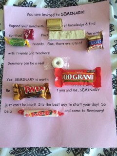 We put our minds together and just really went out and invited all of those youth who are of age to come to seminary! Our seminary secretary gave us a great welcoming idea with a candy gram, so we made one for each of our students and invited them personally—the other youth did.