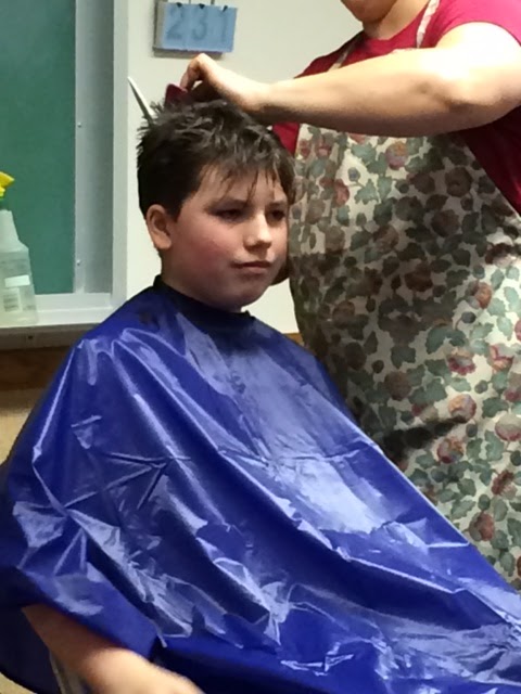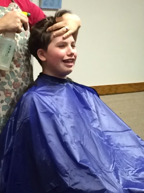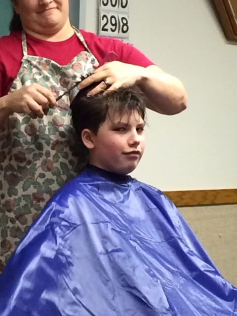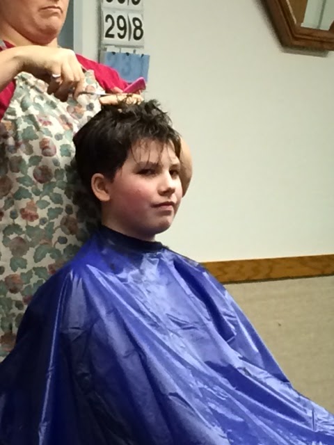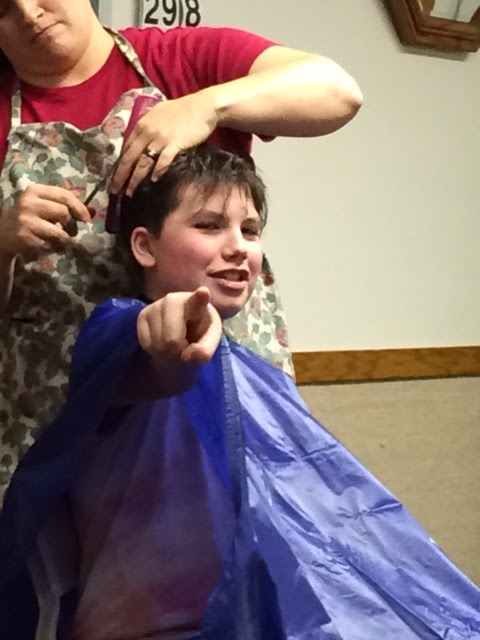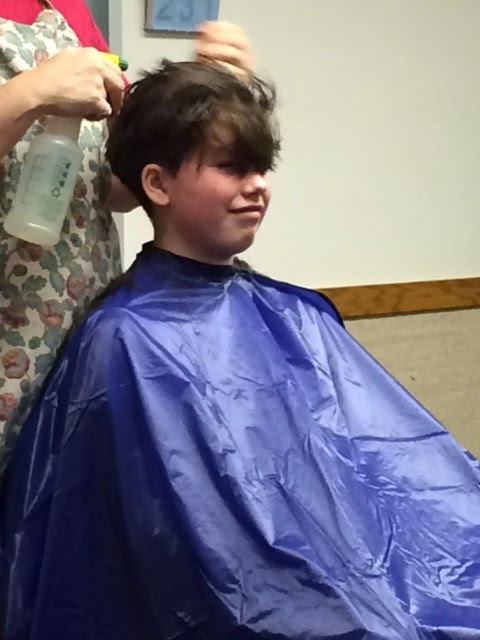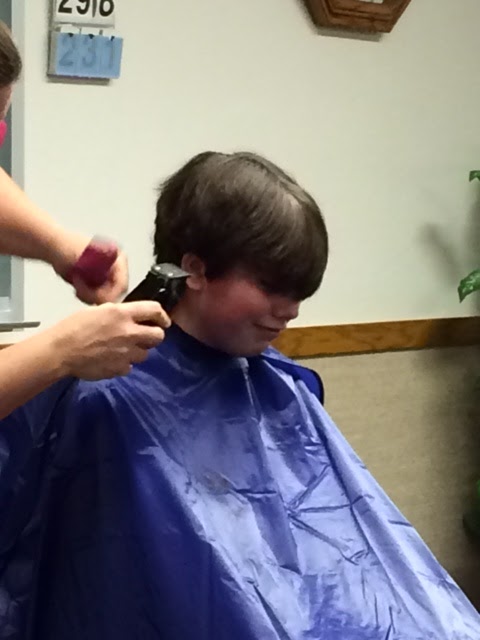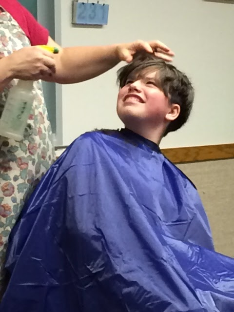We let him get out of the chair and then Sun said, “Hey Mom, he still has a line in the back of his head!” So we sat him back down and blended that line into the rest of the hair. Viola! Done.